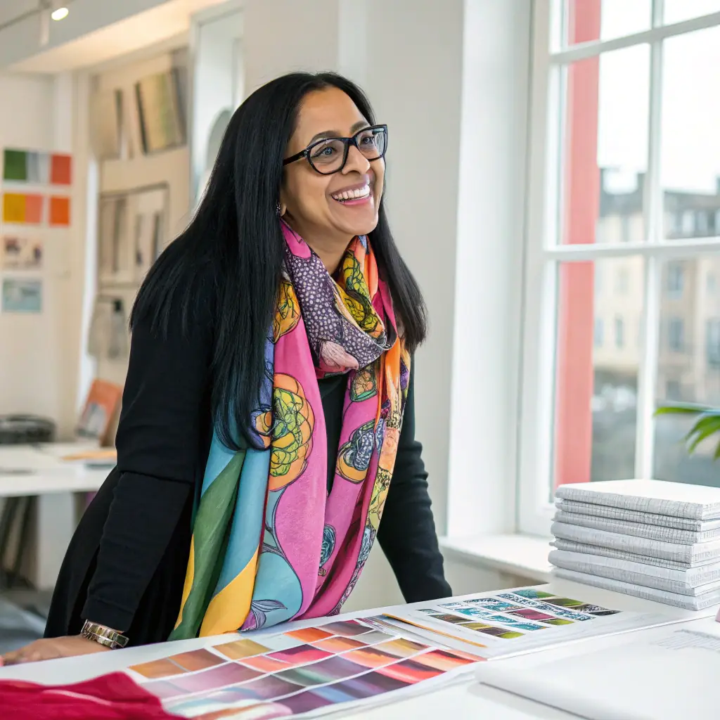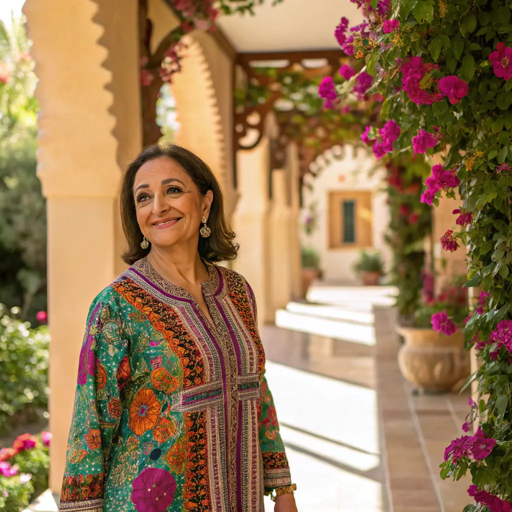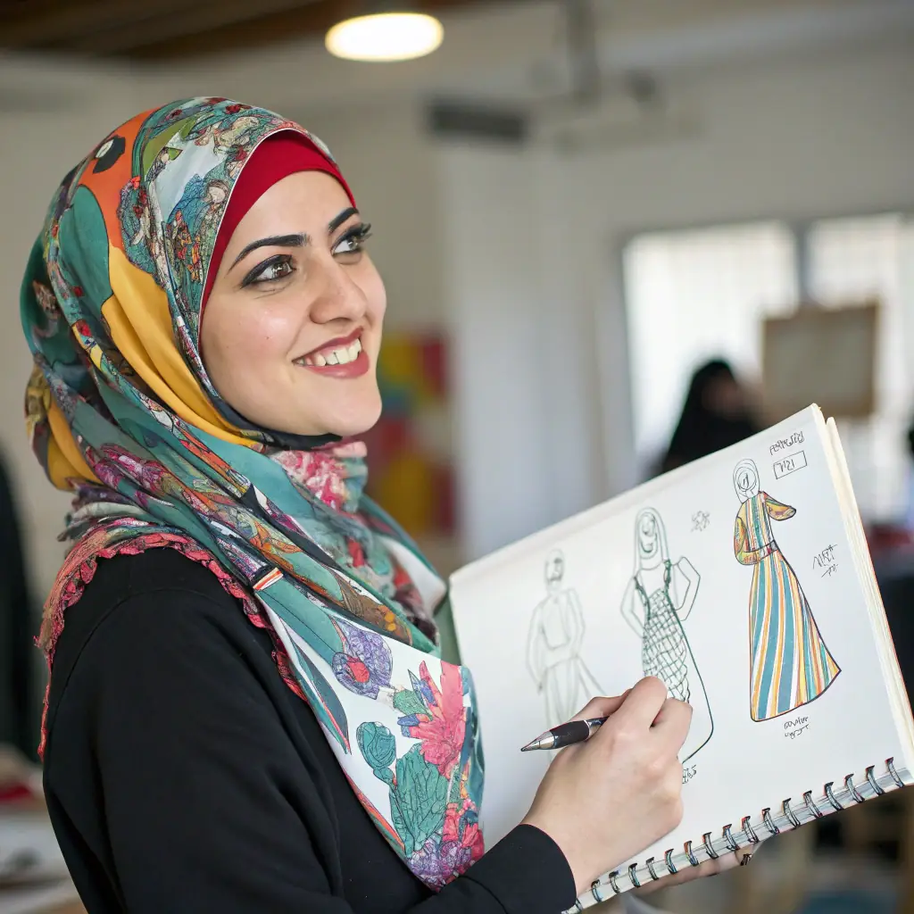 Khadija designs vibrant textiles, incorporating traditional Moroccan motifs.