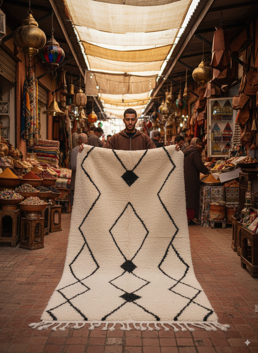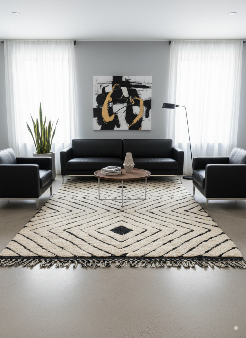 This hand-knotted rug features the iconic Berber diamond motif, symbolizing protection and harmony. Its striking contrast of black on cream makes it a centerpiece rug that effortlessly elevates any living space.